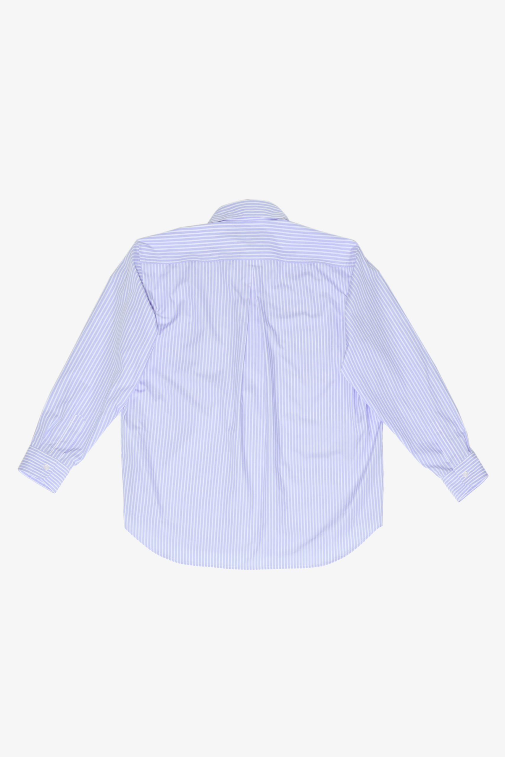 Button-up shirt in stripe white and light blue cotton poplin. Loose fit with curved hem and single chest pocket. Features wave seam detail down each arm and a classic shirt collar. Boxy, oversized fit. Unisex.